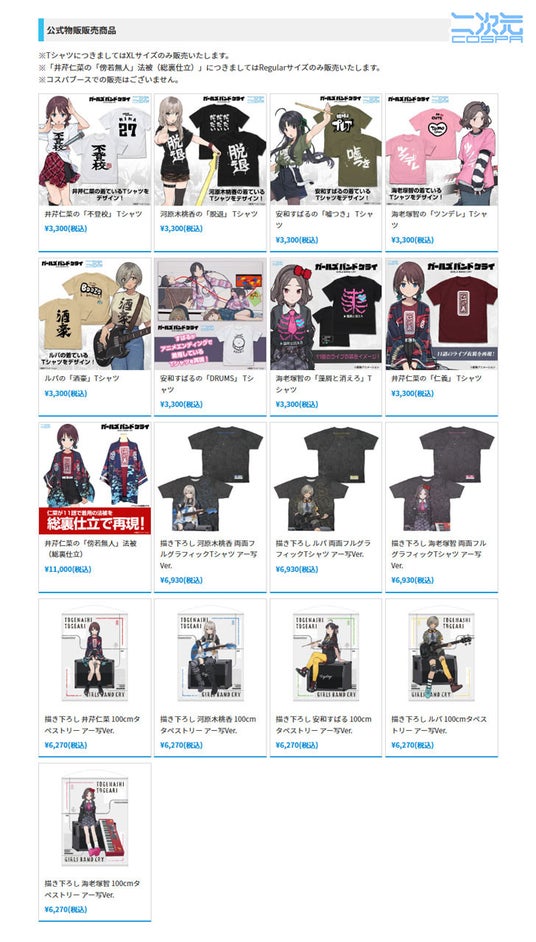 【公式キャラクターアパレル・グッズ/二次元コスパ】アニメ『ガールズバンドクライ』商品販売情報