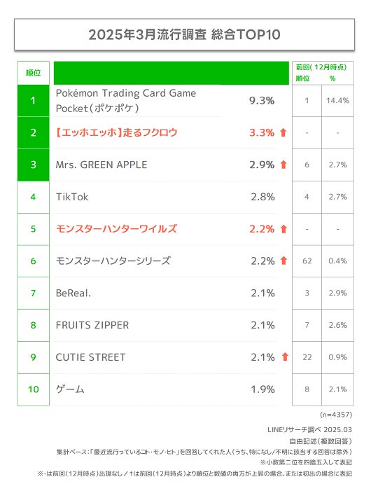 「LINEリサーチ」では、全国の15~24歳の若年層の男女を対象に、四半期ごとに最近の流行についてアンケート調査(自由記述形式)を実施しています。この度は、2025年3月の調査結果をお知らせします。