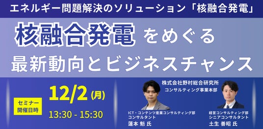 JPI(日本計画研究所)は、株式会社野村総合研究所 コンサルティング事業本部 コンサルタント 蓮本 魁 氏、コンサルティング事業本部 シニアコンサルタント 土生 善昭 氏を招聘し、核融合発電をめぐる最新動向とビジネスチャンスについて詳説いただくセミナーを開催します。