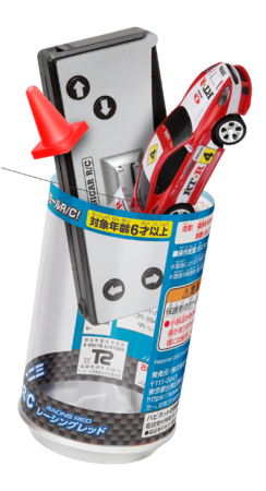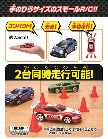 手のひらサイズ(1/58サイズ)でありながら前進、後進、左右へ動かすことが出来る本格R/Cです。さらに前進でヘッドライト、後進でテールランプが点灯!コーンも4個付きでコントローラーから充電可能!いつでもすぐに遊べます。携帯性が良い缶型パッケージで持ち運びも容易です。車種は全部で6種類。周波数は40MHz(3種)と27MHz(3種)の2種類展開なので、違う周波数同士で一緒に遊べます。