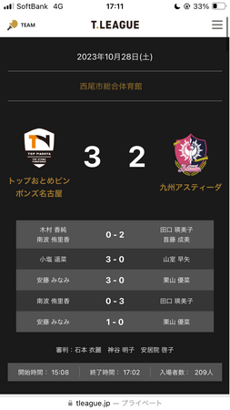 2023-10-29 一般社団法人Tリーグ ノジマ リーグ 2023-2024シーズン 公式戦 10月28日開催 トップおとめピンポンズ名古屋vs九州アステ ィーダ 試合結果 Tweet トップおとめピンポンズ名古屋と九州アスティーダの試合は、3-2でトップおとめピンポンズ名古屋が勝利しました。 企業プレスリリース詳細へ PR TIMESトップへ 公式ツイッター Follow @Straightpress 最新情報をTwitterで受け取ろう! 公式フェイスブックページ 最新情報をFacebookで受け取ろう! 前の記事 一覧へ戻る 次の記事