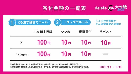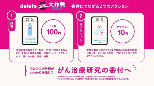 (5)寄付 1投稿あたり100円が、1リポスト/いいね(※1)/1再生/あたり10円が、がん治療研究への寄付・啓発費用として、当社からdeleteCに贈られます(※2)。