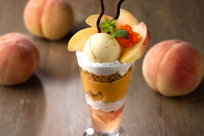 契約農家「林農園」(山梨県山梨市)が手塩にかけて育てた桃をたっぷりと使用したパフェ。アクセントの、ほのかに香るショウガをきかせた桃ゼリーや、わらびもちとともにお召し上がりください。