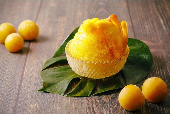 旬のマンゴーに和歌山産の紀州南高梅の爽やかさが加わったソースをマンゴー味のふわふわの氷にたっぷりとかけてお召し上がりいただきます。鮮やかな見た目も夏らしい、甘酸っぱいかき氷をお楽しみください。