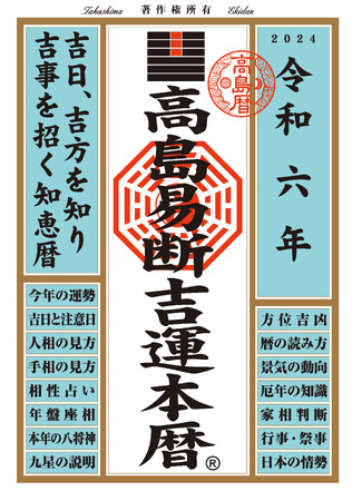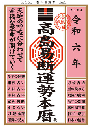 株式会社ディスカヴァー・トゥエンティワン(本社:東京都千代田区、取締役社長:谷口奈緒美)は2023年7月21日に『令和六年 高島易断本暦』『令和六年 高島易断開運本暦』『令和六年 高島易断運勢本暦』『令和六年 高島易断吉運本暦』(高島易断協同組合・著)を刊行しました。