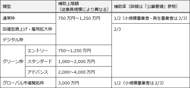 中小企業・小規模事業者等が取り組む革新的サービス開発・試作品開発・生産プロセスの改善(以下、「生産性向上」という。)に必要な設備・システム投資等を支援する「通常枠」、業況が厳しい事業者が賃上げ・雇用拡大の取組に資する生産性向上に必要な設備・システム投資等を支援する「回復型賃上げ・雇用拡大枠」、DXに資する生産性向上に必要な設備・システム投資等を支援する「デジタル枠」、温室効果ガスの排出削減に資する取組に応じた生産性向上に必要な設備・システム投資等を支援する「グリーン枠」、海外事業の拡大等を目的とした設備投資等を支援する「グローバル市場開拓枠」について、本日より公募を開始しました。