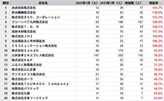 「誰もが活躍できる仕組みをつくる。」をミッションに掲げ、セールスチームの武器となるデータベース「SalesNow」を展開する株式会社SalesNow(本社:東京都渋谷区、代表取締役:村岡功規、以下「SalesNow」)は、国内550万社の企業情報を完全網羅した日本最大級のデータベース「SalesNow DB」より、熊本県に本社を置く企業の2024年1月時点および2025年1月時点の従業員数データを分析し、従業員数増加率ランキングTOP20を発表しました。本ランキングは、各企業の成長スピードを可視化するものであり、新規雇用の創出や事業拡大の動向を明らかにしています。