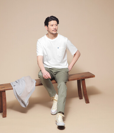 ポロシャツと同じく、スーピマコットンを用いたALBINI社の綿糸「CORCORAN(コーコラン)」を使用したTシャツは、素材の良さからくる滑らかな肌触りと光沢により、上品な印象とカジュアルなデザインのバランスがとれた大人のトップスに仕上がりました。胸ポケットにはBERKLEYカラーのグログランテープをあしらい、プレッピーな雰囲気をプラス。袖は二の腕が隠れるくらいのやや長めの丈に設定されており、ビジネスシーンでの着用を意識したサイズ感です。1枚で着るラフなスタイルからセットアップのインナー使いまでユーティリティーに活躍します。