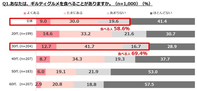 ・「ギルティグルメ」を食べる人は約60%。年代の差が大きく、30代では約70%。