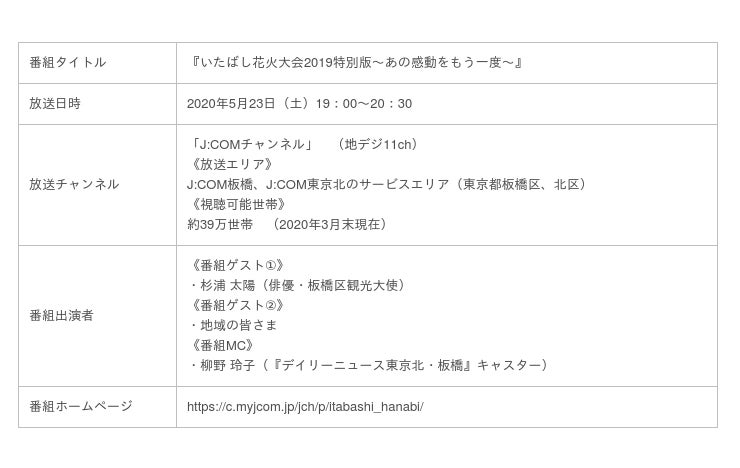 J:COMでは、これからも地域イベントの番組放送を通じ、地域の活性化に向け貢献してまいります。「いたばし花火大会」は、板橋区の荒川河川敷を会場に、対岸で同時開催の戸田橋花火大会と合わせて約12,000発の花火が打ち上がり、東京を代表する花火大会としても知られています。しかし今年は新型コロナウイルス感染症拡大の影響により大会中止が決まったため、2019年の放送をリメイクした特別版を制作し放送します。