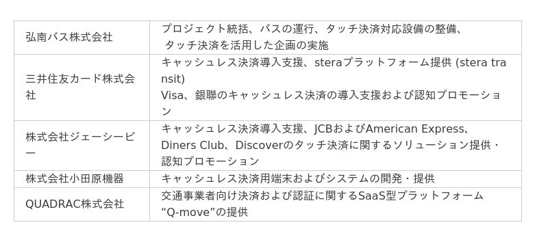 弘南バス株式会社(本社:青森県弘前市、代表取締役社長:工藤 智久)、三井住友カード株式会社(本社:東京都江東区、代表取締役社長:大西 幸彦)、株式会社ジェーシービー(本社:東京都港区、代表取締役兼執行役員社長:二重 孝好)、株式会社小田原機器(本社:神奈川県小田原市、代表取締役:丸山 明義)、QUADRAC株式会社(本社:東京都港区、代表取締役社長:高田 昌幸)は、2025年3月17日(月)より、三井住友カードが提供する公共交通機関向けソリューション「stera transit」を活用した、タッチ決済対応のカード(クレジット、デビット、プリペイド)や、カードが設定されたスマートフォン等による乗車サービスを開始することを発表します。