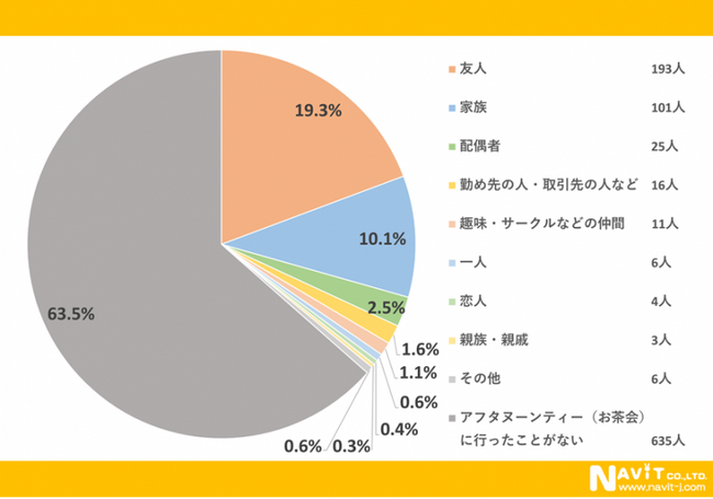 アフタヌーンティー(お茶会)には誰といくのが1番多いかというと、「友人」が19.3%で1番でした。次に「家族」10.1%、「配偶者」2.5%と続いています。時間をかけてゆっくりとお茶を楽しむので、気が合う仲間で行くことが多いのでしょう。