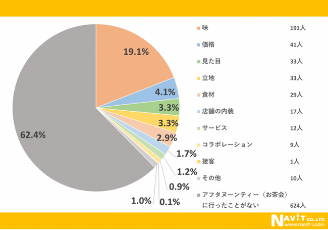 アフタヌーンティー(お茶会)に何を求めるかというアンケートに対して「味」という回答が1番多く19.1%でした。嗜好品の部類に入りますので、味は妥協したくないところです。次に「価格」4.1%、「見た目」「立地」が共に3.3%となっています。