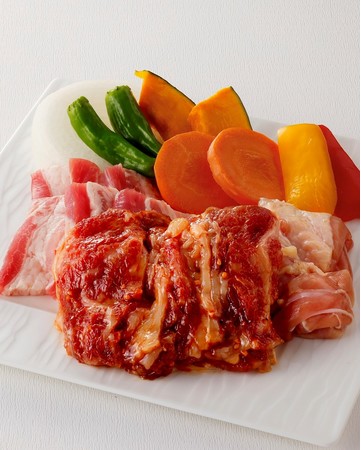 内容:和牛カルビ、オランダ風車豚ばら肉、鶏肉 各150g、野菜盛り合わせ