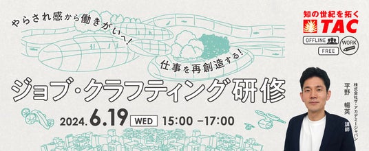 公認会計士や税理士など、多くの国家資格や検定試験の受験指導などの教育事業を展開しているTAC株式会社(東京都千代田区、代表取締役:多田敏男)は、法人向け人材教育部門から、人事・教育担当者に向け、仕事を再創造しやらされ感から働きがいへチェンジする「ジョブ・クラフティング研修」について解説するセミナーを2024年6月19日(水)に実施します。