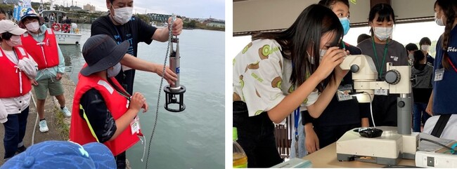 また、港では水質調査、水中カメラでの観察などを行いました。海の中をのぞいてみると、大量のウグイの姿が見えました。子どもたちは、「思ったよりも沢山魚がいた!陸からは見えなかったから驚いた。」と話していました。数匹、カメラの横につけたエサを突っついていましたが、動きが早く、姿をしっかりと目視するのは一苦労です。プランクトン採取では、特殊な機械を使ってプラクトンを採取。小さい何かが動いている事が、肉眼では分かるのですが、形までははっきりと見えず…。子どもたちは、小さなプランクトンの動きに注目した後に顕微鏡を使って観察。植物プランクトンと動物プランクトンの違いやその特徴を学びました。