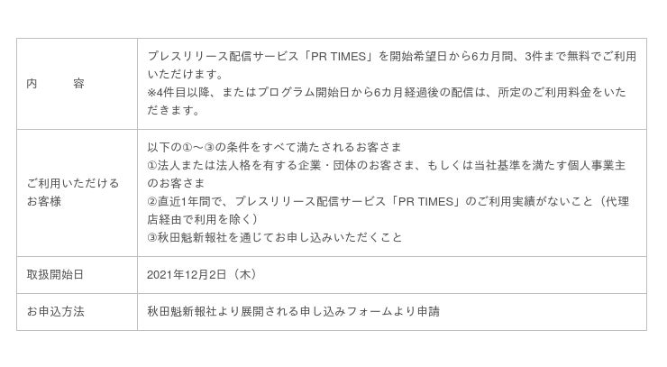 秋田魁新報社から紹介の企業へ、開始日から6カ月間、3件まで無料で「PR TIMES」にてプレスリリース配信いただける「秋田魁新報社プログラム」を提供します。