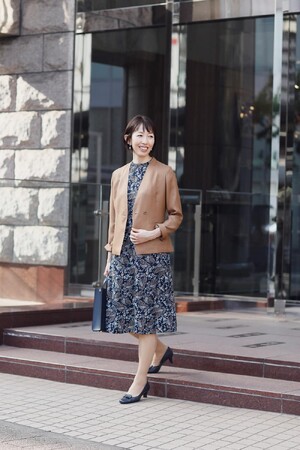 シックで華のある通勤スタイル 花柄ワンピ×ネイビージャケット