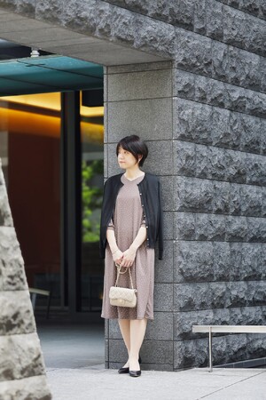 流行りのアフタヌーンティーやホテルランチなど、プチ贅沢デーには少しだけ背伸びをしておでかけ。細かいドットで気分を高めつつ、ブラックのカーディガンを合わせて大人ビターに。ワンピースは、落ち感のある素材を活かしたストンとしたIラインシルエット。ベージュのチェーンバッグをアクセサリー代わりにして、休日を楽しんで。