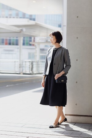 オールマイティーな上品アイテム ブラックドレス×グレージャケット