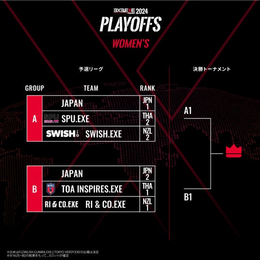 ※日本はFLOWLISH GUNMA.EXEとTOKYO VERDY.EXEの出場が確定しておりますが、9/16の試合結果を持って順位が確定し、PLAYOFFS出場の枠も同時に確定致します。