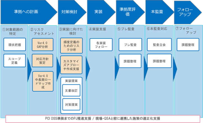 決済領域に関する豊富な知見とコンサルティング経験を活かし、システムインテグレータとしてのSI技術力、クラウド事業者パートナーとしてのクラウド知見、ASV(認定スキャンベンダー)としての脆弱性診断等、当社グループが持つ豊富なサービスにより、PCI DSSv4.0に対応したセキュリティアセスメント、及び対策支援を実施します。