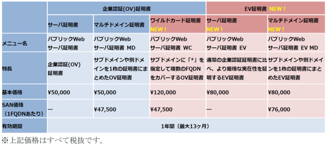 今回のリニューアルに伴い、ワイルドカード証明書とEV証明書を商品ラインナップに追加したことで、同一のドメイン名で複数のWebサイトを運用しているお客様はワイルドカード証明書、ECサイトなど、より高いセキュリティが必要なお客様はEV証明書など、従来よりもお客様の目的に合ったWebサーバ証明書をお選びいただけるようになりました。