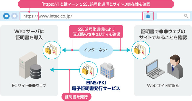 このような状況を受け、インテックは、お客様がより簡便に自社Webサイトのセキュリティを強化できるよう「パブリックWebサーバ証明書発行サービス(EINS/PKI)」のサービスをリニューアルしました。