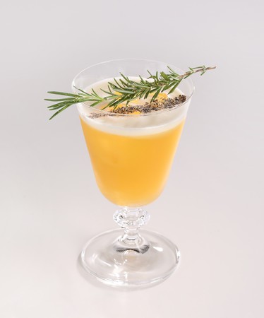 力強い味わいのバーボンウイスキーに、パインアップルのピュレを合わせることで優しいフルーティーなカクテルに仕上がりました。飾られたブラックペッパーは道なき道を歩み作り上げた証、金粉をあしらったローズマリーでいばらの道の後に残る黄金の軌跡を表現しています。