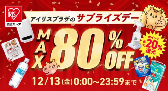 12月13日の「アイリスプラザのおトクなセール」は、アイリスプラザにおいて、対象商品が最大80%割引でご購入いただけるおトクな割引セールです。そのほか期間中に対象商品をご購入いただくと、最大20%のポイント還元や最大1,500円割引のおトクな割引クーポンを配布します。