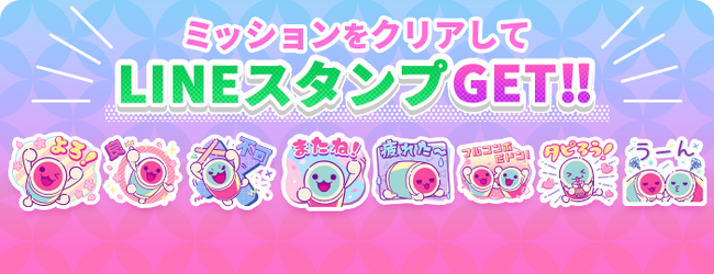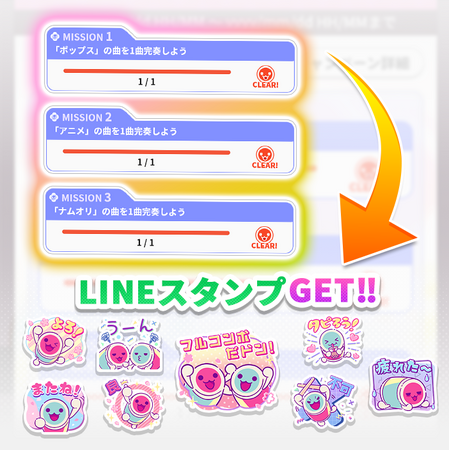 期間中、「太鼓の達人」でお馴染みのキャラクター「どんちゃん」「かっちゃん」の無料LINEスタンプが登場しま す。スタンプはゲーム内のミッションをクリアすることで手に入れることができます。 ※詳細はゲーム内をご確認ください。