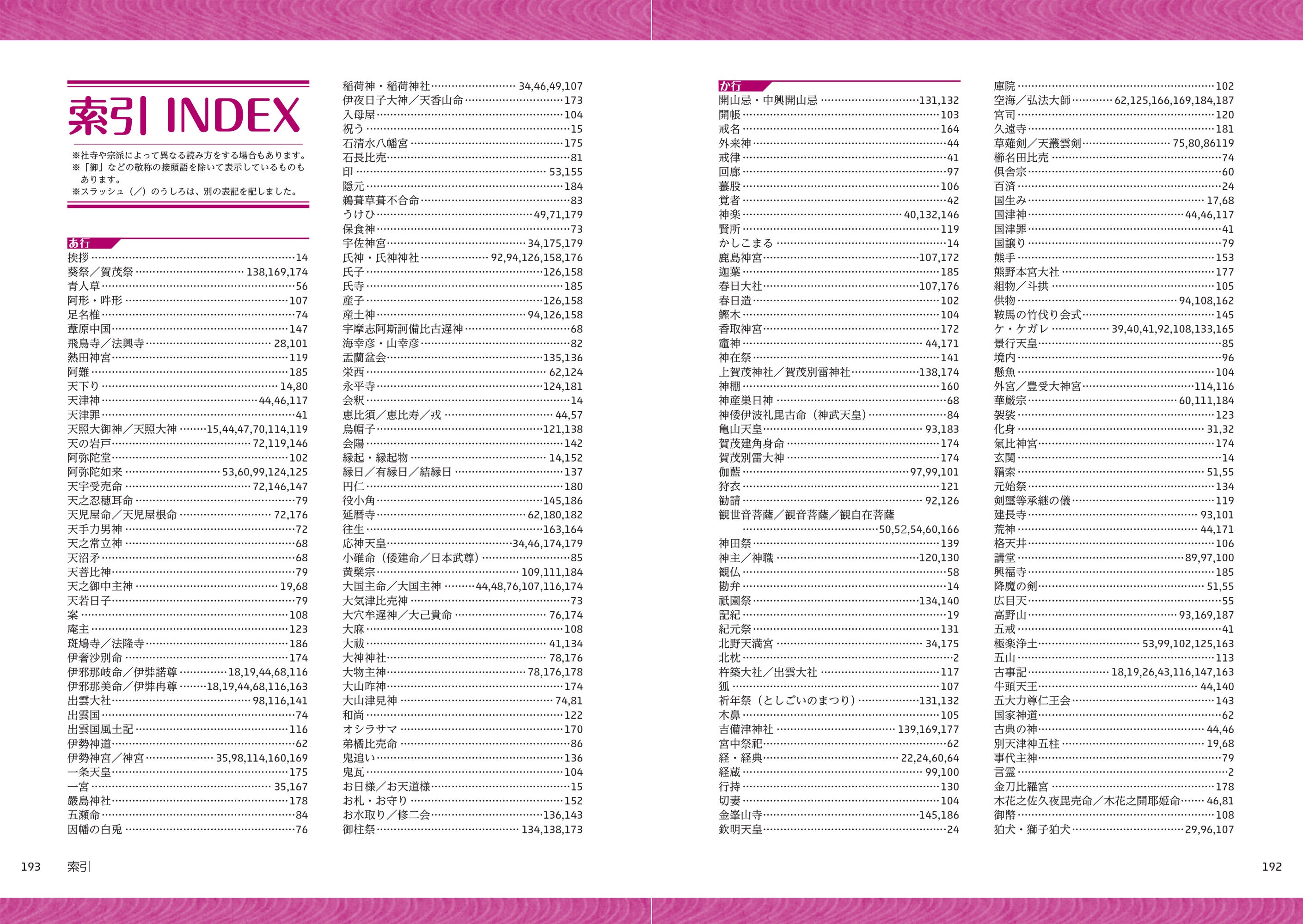 その他、主要な神様と仏様、一度は訪れたい神社と寺院、特殊神事や寺院独自の行事、さらに日本神話のダイジェストなど、教養としてこれだけは知っておきたいことも簡潔に紹介。巻末には、知りたいことがすぐわかる便利な索引つきです。