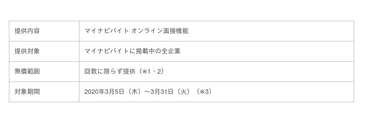 株式会社マイナビ(本社:東京都千代田区、代表取締役社長:中川信行)が運営するアルバイト情報サイト『マイナビバイト』(https://baito.mynavi.jp/)は、このたびの新型ウイルス感染症拡大の影響を受け、3月31日(火)まで(※1)掲載企業に対してオンライン面接機能を無償(※2)で提供します。