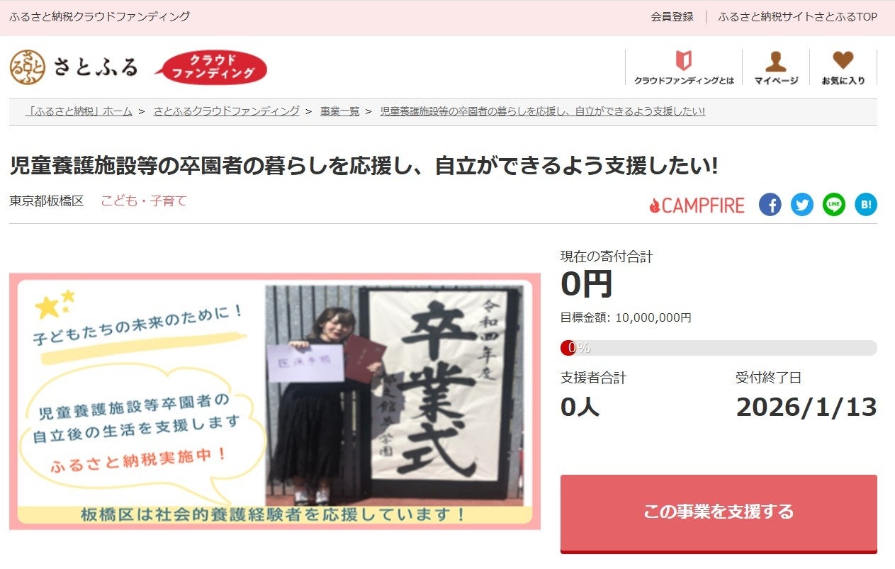 東京都板橋区とふるさと納税ポータルサイト「さとふる」を運営する株式会社さとふる(本社:東京都中央区、代表取締役社長 兼 CEO:藤井 宏明)は、「さとふるクラウドファンディング」にて、「児童養護施設等の卒園者の暮らしを応援し、自立ができるよう支援したい!」の寄付受け付けを2025年10月16日より開始しました。