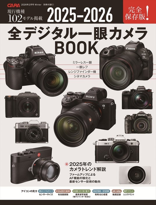 特集は「25-26Winter 購入ガイド」。各社の人気ミラーレスカメラ選び、2025年発売のレンズ19本、話題の撮影アイテム&写真用品を編集部がピックアップ。さらに「ニューモデル瞬速実写レビュー」と題し、キヤノンEOS R6 MarkIII、ソニーα7V、ライカ M EV1の実力に迫ります。このほか、撮影テクニック「夜空の絶景 星景撮影にチャレンジ!」、ほかにも富士6時間耐久レース撮影セミナーin富士スピードウェイ、高校写真部応援プロジェクトのレポート記事など、CAPA 2月号 Winterもカメラ・写真を楽しむための記事が満載です。