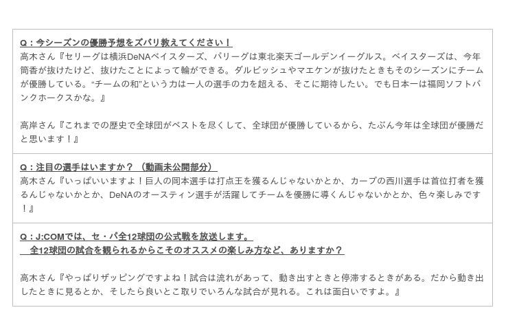 「J:COMプロ野球セ・パ全12球団放送記念 高木豊×ティモンディ×Number編集長 スペシャル対談」の模様はYouTubeのJ:COM公式チャンネル(https://youtu.be/4_THhlos7Ec)と高木豊さんとティモンディさんの公式チャンネルで公開していますので、ぜひご覧ください。