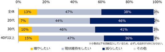 - 一方で、労働時間を「増やしたい」方は1割。半数が「現状維持」、約4割が「減らしたい」。