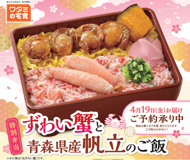 ワタミ株式会社(本社:東京都大田区、代表取締役社長:渡邉 美樹、以下「ワタミ」)が運営する食事宅配サービス「ワタミの宅食」は、季節限定の特別弁当として予約受付を行っている「ずわい蟹と青森県産帆立のご飯」(以下、「ずわい蟹と帆立のご飯」)が4万食を突破しましたことをご報告いたします。