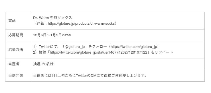 株式会社Glotureは、ECサイト『GLOTURE.JP』で好評販売中のリモコンで温度調整できる発熱靴下「Dr. Warm 発熱ソックス」について、GlotureのTwitterアカウントをフォローし、対象の投稿をリツイートすることで、抽選で2名様に当たるキャンペーンを12月6日より行っています。履いて30秒で足の先までほかほかになるハイテク靴下が手に入るチャンスなので、この機会にぜひご応募ください。(1月5日締め切り)