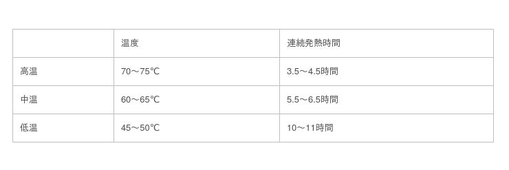 発熱温度:低温 45~50℃(10~11時間)、中温 60~65℃(5.5~6.5時間)、高温 70~75℃(3.5~4.5時間)