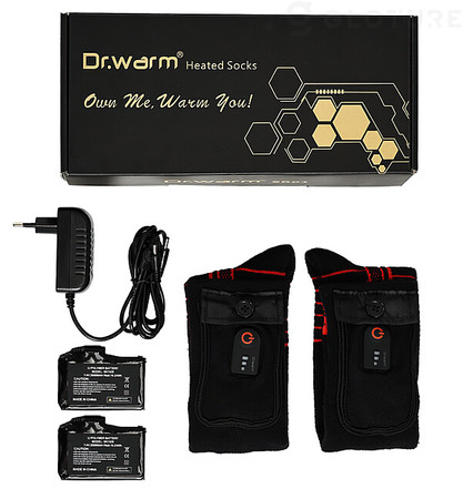 同梱物:Dr. Warm 発熱ソックス、リチウムイオン電池×2、デュアルポート充電器、リモコン、説明書(英語)