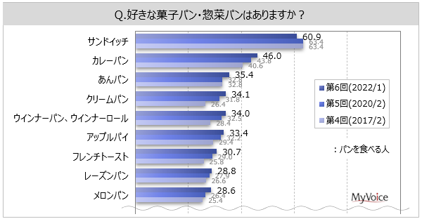 ■好きな菓子パン・惣菜パンは「サンドイッチ」がパンを食べる人の6割強、「カレーパン」が46%、「あんパン」「クリームパン」「ウインナーパン、ウインナーロール」「アップルパイ」「フレンチトースト」が各30%台