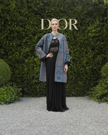 エリザベス・デビッキは、2022-2023年秋冬オートクチュール コレクションより、キャメルとブラックのチェッカーボードモチーフにフェルトのアップリケがあしらわれたツートンカラーのコートにブラックシフォンのトップとスカートを合わせ、ディオールのハイジュエリー コレクションより、ホワイトゴールドにダイヤモンド、エメラルド、ブルーサファイアがあしらわれた「ソワ ディオール」 のネックレスとブルーサファイアのイヤリングを纏い登場。