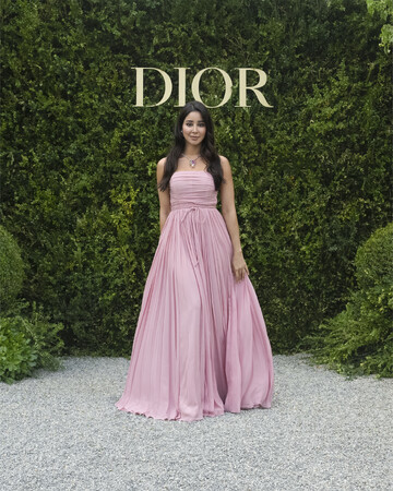 アシール・オムランは、ピンクプリーツのビスチェドレスに、ディオールのハイジュエリー コレクションより、イエローゴールドにエメラルド、ピンクサファイア、マザーオブパールがあしらわれた「タイ&ディオール」のネックレスとイヤリングを纏い登場。