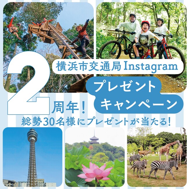 横浜市交通局公式Instagram2周年を記念して、フォレストアドベンチャー・よこはまや、トレイルアドベンチャー・よこはま、横浜マリンタワー、三溪園、よこはま動物園ズーラシアなど人気施設のペアチケット、ベイエリアの市営地下鉄と市営バスを1日利用できるみなとぶらりチケットとオリジナルストラップ(非売品)、など素敵なプレゼントが抽選で総勢30名様に当たるキャンペーンを実施します。