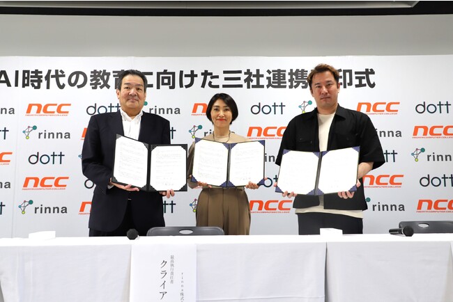 NSGグループの学校法人国際総合学園 新潟コンピュータ専門学校(新潟市中央区、学校長:小島友昭、以下「NCC」)は、7月28日(金)、NCCキャンパスにて「AI時代の教育に向けた三社連携調印式」を挙行。AI分野を支える人材育成を推進するため、rinna株式会社(東京都渋谷区、代表取締役:ジャン“クリフ”チェン、以下「rinna」)および株式会社dott(東京都台東区、代表取締役:浅井渉、以下「dott」)と連携協定を締結いたしました。