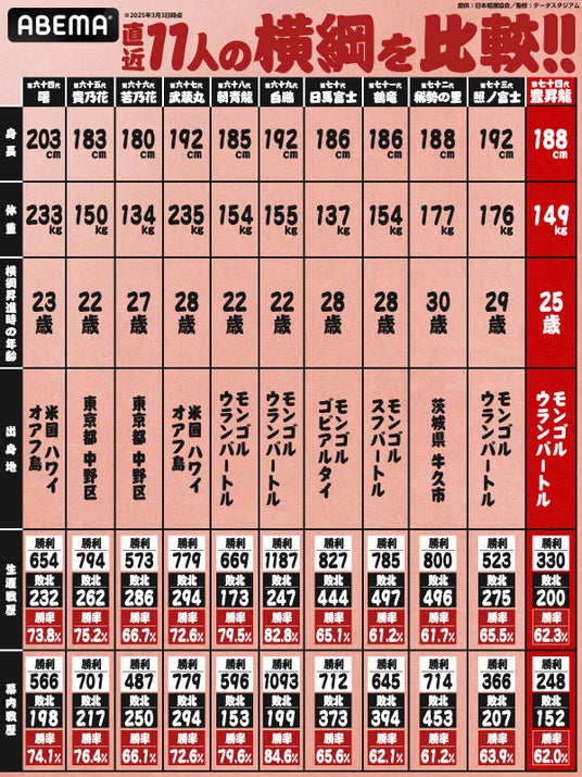 新しい未来のテレビ「ABEMA(アベマ)」は、大相撲三月場所の開催にあわせ、「データで見る大相撲」として歴代横綱のデータを分析、特に直近10人の横綱と新横綱・豊昇龍関の比較を公開しました。