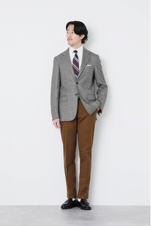 今シーズンは、マルチPLY(多数の糸を撚り合わせ太くしたもの)の特性をいかしたブリティッシュライクな生地をご用意。シーズンテーマの“NEO BRITISH”に相応しい、仕立て映えする程よい厚さと、英国らしい暖かみのあるジャケットが完成しました。ハイゲージのニットを合わせたカジュアルスタイルはもちろん、スラックスを合わせタイドアップしたビジネススタイルもおすすめです。