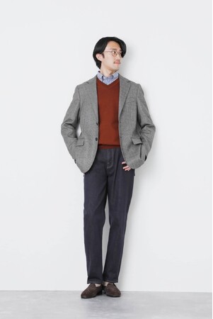 チェックジャケットを中心に、暖色のニットと寒色のシャツ・デニムを組み合わせ奥行きのあるスタイリングを構成。足元はスエードローファーを合わせて季節感を演出。