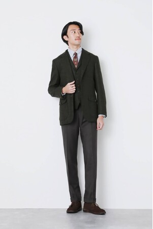 グリーン・ブラウン・ワインレッドで構成した暖かみのあるコーディネート。英国らしいドレッシーなスタイリングには、ライトグレーのオックスフォードシャツを取り入れてさり気なくスポーティーさをプラス。